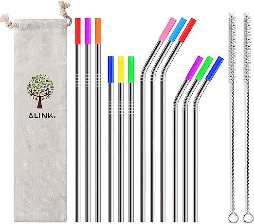 These stainless steel straws on Amazon come with 12 straws in 4 different shapes and sizes. It also includes 2 cleaning brushes which are a must for cleaning your reusable straws.