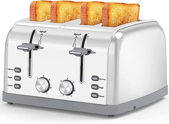 The Lainsten 4 -slice toaster is a professional ETL-certified toaster, designed in the USA with a full stainless steel body that will pass any resistance test. It also features an anti-jam function and a high-lift design to offer you a safe and convenient bread toasting experience!
