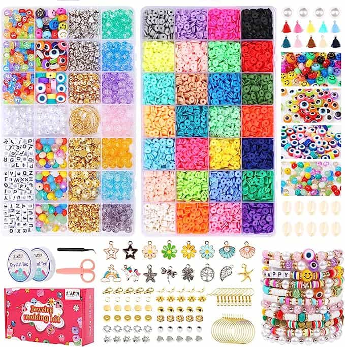 The clay beads bracelet making kit contains two 28-compartment storage boxes and an accessories package. One box has about 6400 Pcs flat clay beads in 28 colors, another has about 1100 Pcs accessory beads for bracelets.Bracelet beads accessory package contains 2 rolls of 6m elastic cords, a pair of scissors and metal tweezers, 10 pcs earring rings, 19 pcs pendants, 10 pcs tassels