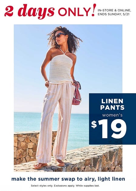 This weekend only, get a pair of women’s linen pants for just $19 from Old Navy Canada! (reg. $44.99 – $49.99).