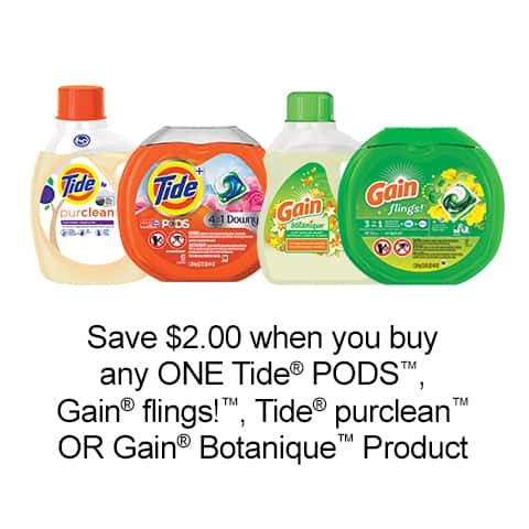 - Save $2.00 when you buy any one Tide Pods, Gain flings!, Gain Botanique or Tide purclean Product